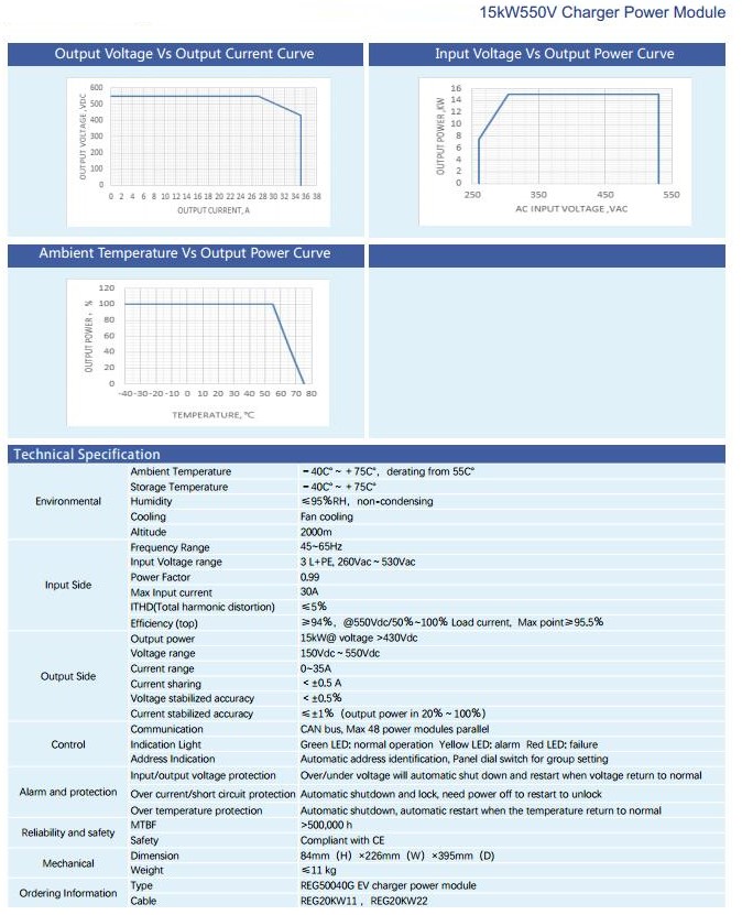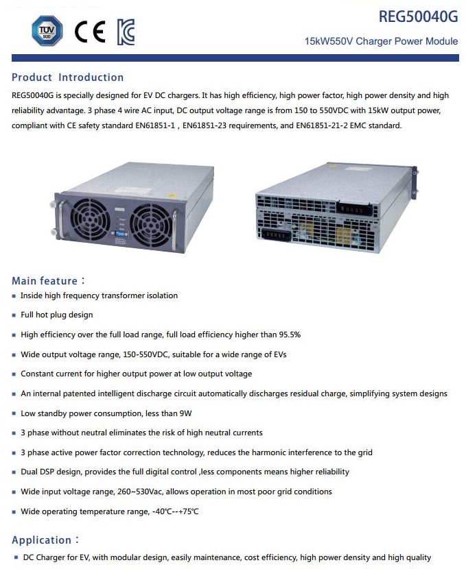 REG75030G is specially designed for EV DC chargers. REG75030G: 15KW@750V Charger Power Module REG75030G is specially designed for EV DC chargers. It has high efficiency, high power factor, high power density and high reliability advantage. 3 phase 4 wire AC input, DC output voltage range is from 150 to 750VDC with 15kW output power, compliant with CE safety standard EN61851-1,EN61851-23 requirements, and EN61851-21-2 EMC standard.